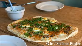 Herrlich Hessisch: Pizza Grüne-Soße mit Roastbeef und Eiern, ausprobiert von hr-Redakteurin Stefanie Küster.